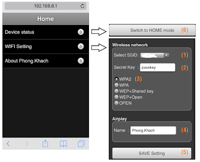 Bạn nhập thông số wifi nhà bạn vào mục (1) & (2). Chọn kiểu mã hóa wifi mục (3), kiểu mã hóa phổ biến hiện nay là WPA2/WPA.Phần Player mục (4) là đặt lại tên loa “Airplay” cho nhà bạn. ví dụ: Phong.Khach chẳng hạn.Chọn SAVE New Setting ở mục (5) để lưu cấu hình.Đợi thiết bị lưu cấu hình xong, bạn chọn Switch HomeMode mục (6) để chuyển sang chế độ hoạt động ở nhà. (Lưu ý: Mỗi lần khởi động sau thiết bị tự hoạt động ở chế độ Home Mode cho đến khi bạn kích hoạt lại chế độ Car Mode).
